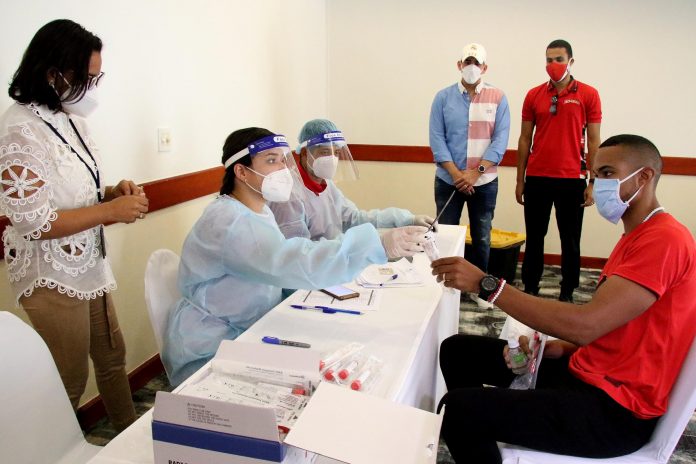 Santo Domingo.- Los Leones del Escogido se sometieron este viernes a pruebas de diagnóstico de COVID-19 en el hotel Quality Real ubicado en la autopista Las Américas, donde el conjunto está concentrado en lo que han llamado “Early Camp”. Médicos y personal del Ministerio de Salud Pública estuvieron realizando el operativo a los jugadores del club, además del staff de coaches y personal de camerino y prensa que trabajará directamente con los 16 veces campeones nacionales.