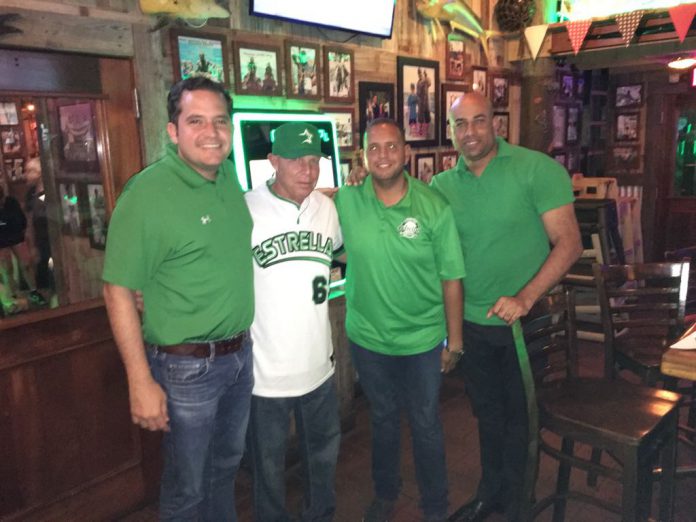 Dean Treanor (segundo desde la izquierda) viste la chaqueta de las Estrellas Orientales en un encuentro con personal del departamento de operaciones de béisbol, para celebrar la firma de su nuevo pacto con el club, en los Estados Unidos. Desde la izquierda José Mallén Calac (viceprersidente de operaciones de béisbol), Treanor, Raúl González (asistente), Miguel Batista (Consultor).