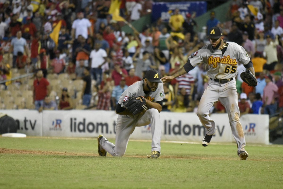 Las Águilas ampliaron la ventaja con tres anotaciones en la parte alta del noveno. Jonathan Villar, quien se había embasado por error del torpedero Erik González, anotó con lanzamiento desviado del pitcher Nelson González y Juan Carlos Pérez agregó sencillo productor para luego anotar con elevado de sacrificio de Ángel Franco.