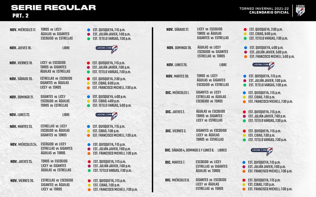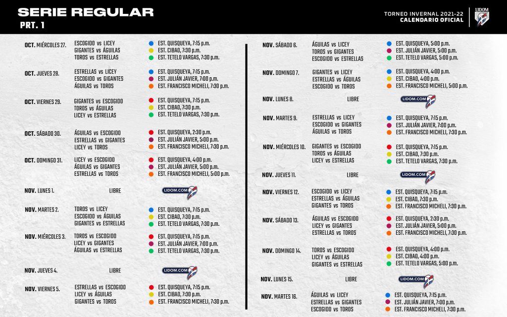 Redacción. La temporada de la LIDOM iniciará con tres encuentros el próximo 27 de Octubre donde el partido principal será el de los actuales campeones las Águilas Cibaeñas recibiendo a los Gigantes del Cibao y se completa la jornada con los encuentros entre Toros del este en casa de las Estrellas Orientales y los Tigres del Licey recibiendo a los Leones del escogido en el estadio Quisqueya.