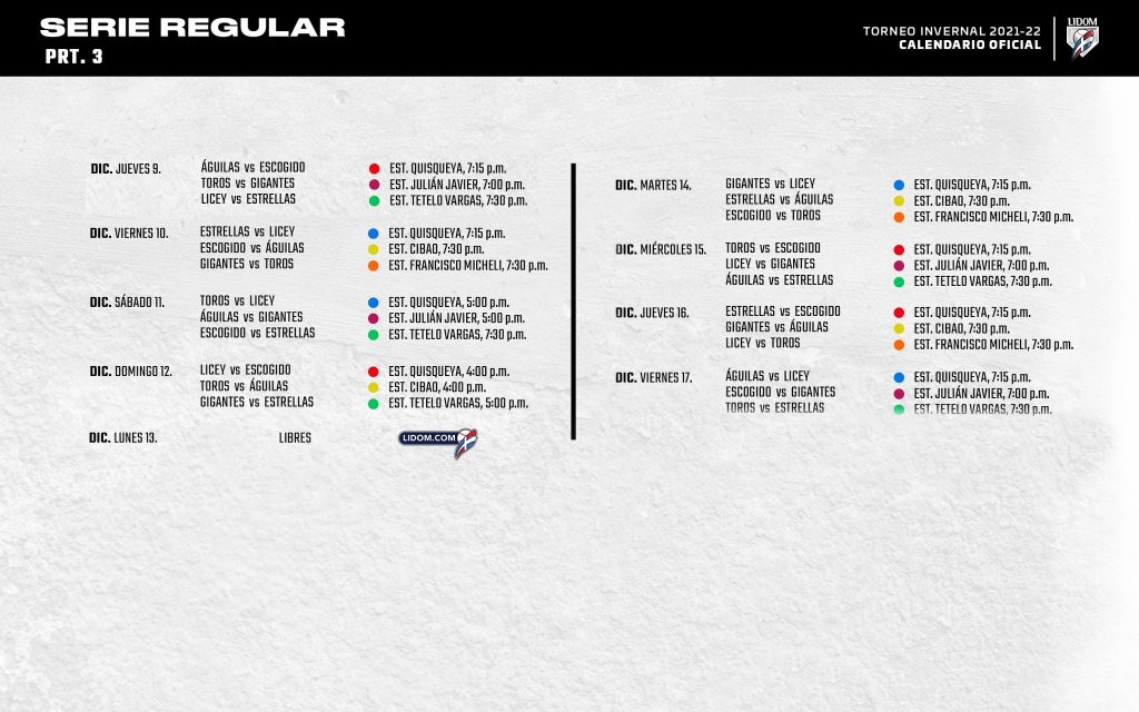 Para el sábado 4 y lunes 6 de diciembre el calendario de la LIDOM descansa porque esas fechas son cedidas para las actividades de la federación nacional de peloteros profesionales.