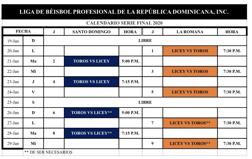 Redacción.- Los Toros del Este y los Tigres del Licey comenzarán la Serie Final este lunes 20 de enero en el Estadio Francisco Micheli de La Romana, pautada al mejor de 9 encuentros luego de que los Azules vencieran en un partido que inició la noche del viernes y finalizó en la del sábdo a las Aguilas Cibaeñas. El primer partido será en la casa y estará pautado para las 7 y 30 de la noche. Luego, el segundo encuentro será a las 5 de la tarde en el Estadio Quisqueya Juan Marichal con los Tigres del Licey reciiendo a los Toros del Este.