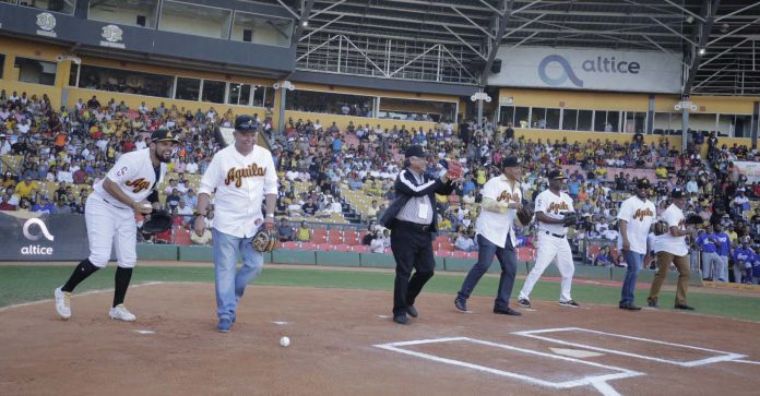 El presidente de las Águilas Cibaeñas, doctor Adriano Valdez Russo, el Vicepresidente de Operaciones de Béisbol Manny Acta, el presidente At-Vitam Winston (Chilote ) Llenas y el presidente de Lidom, Vitelio Mejía, se colocaron en una imponente tarima para recibir a cada uno de los jugadores y personal que fueron y son partes del conjunto con sede en Santiago.