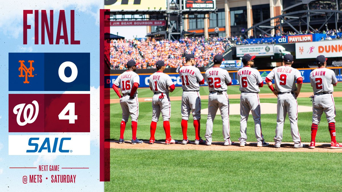 Stephen Strasburg fue el ganador del partido al tirar seis entradas y dos tercios en blanco con solo 3 hits, un boleto y nueve ponches. Noaj Syndergaard cargó con la derrota por su labor de seis entradas de un solo hit, dos carreras limpias, 2 boletos y 6 ponches. Jeurys Familia tiró en relevo una entrada en blanco en que permitió una base por bolas y ponchó a tres oponentes. Por los Mets a la ofensiva, Robinson Canó se fue de 3-0 con una base por bolas, Ahmed Rosario de 4-1 y Juan Lagares se fue en blanco en 2 oportunidades oficiales, ligando una base por bolas.
