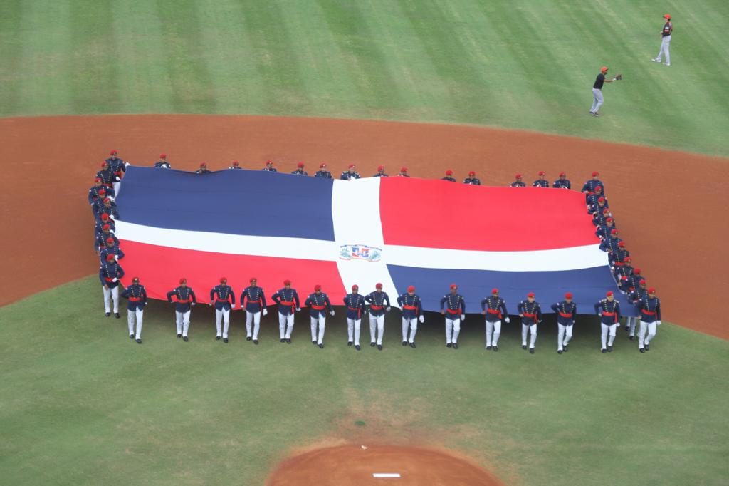 Una gigante bandera nacional fue llevada al centro del terreno por el Regimiento de la Guarda de Honor del Ministerio de Defensa, al compás de una marcha interpretada por la Banda de Música del Ejército de República Dominicana, dirigida por el teniente coronal Manuel Pérez.  Mientras la citada banda del Ejército, dirigida por el primer teniente Jorge Luis Morillo Alberto, interpretaba las notas del glorioso Himno Nacional dominicano, los presentes disfrutaron de los vuelos de una cuadrilla de tres naves Súper Tucanos, que dieron una segunda pasada, mientras se retiraba la gran bandera tricolor.