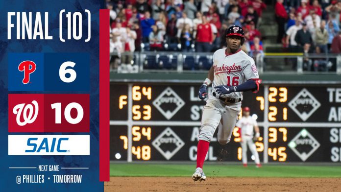 Víctor Robles disparó su tercer cuadrangular de la temporada en la parte alta del noveno episodio ante los envíos del venezolano Edubray Ramos, cuando ya los Filis estaban a dos outs de conseguir la victoria. Luego le tocó el turno a Juan Soto, que en el décimo episodio enfrentando al también venezolano José Álvarez, conectó un batazo de 406 pies muy cercano al poste del lado derecho del terreno que puso por delante 9 carreras por 6 a los Nationals sobre los Phillies. Para completar la entrada, otra vez Robles conectó un doble al jardín derecho que trajo a la goma a Ryan Zimmerman. Robles terminó el partido de 5-3 con dos anotadas y dos carreras remolcadas y Juan Soto se fue de 3-1 con una anotada, tres remolcadas y 2 bases por bolas negociadas.
