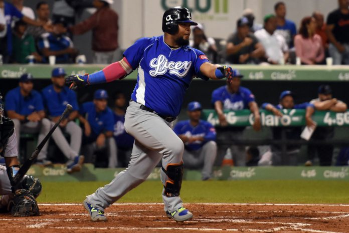 Yamaico Navarro quien empalmó cuadrangular en la victoria de los Tigres del Licey por 7 a 3 sobre las Estrellas Orientales en el Estadio Tetelo Vargas, el miércoles 22 de noviembre de 2017. (Foto crédito: Prensa Tigres del Licey)