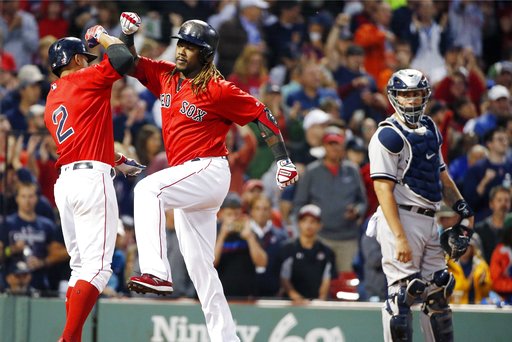 Boston Red Sox's Hanley Ramirez, center, celebrates his two-run home run that also drove in Xander Bogaerts as New York Yankees' Gary Sanchez looks on during the third inning of a baseball game in Boston, Friday, July 14, 2017. (AP Photo/Michael Dwyer)